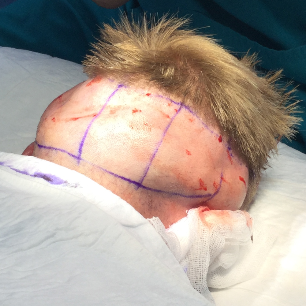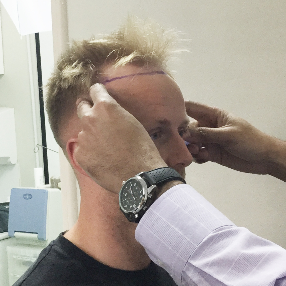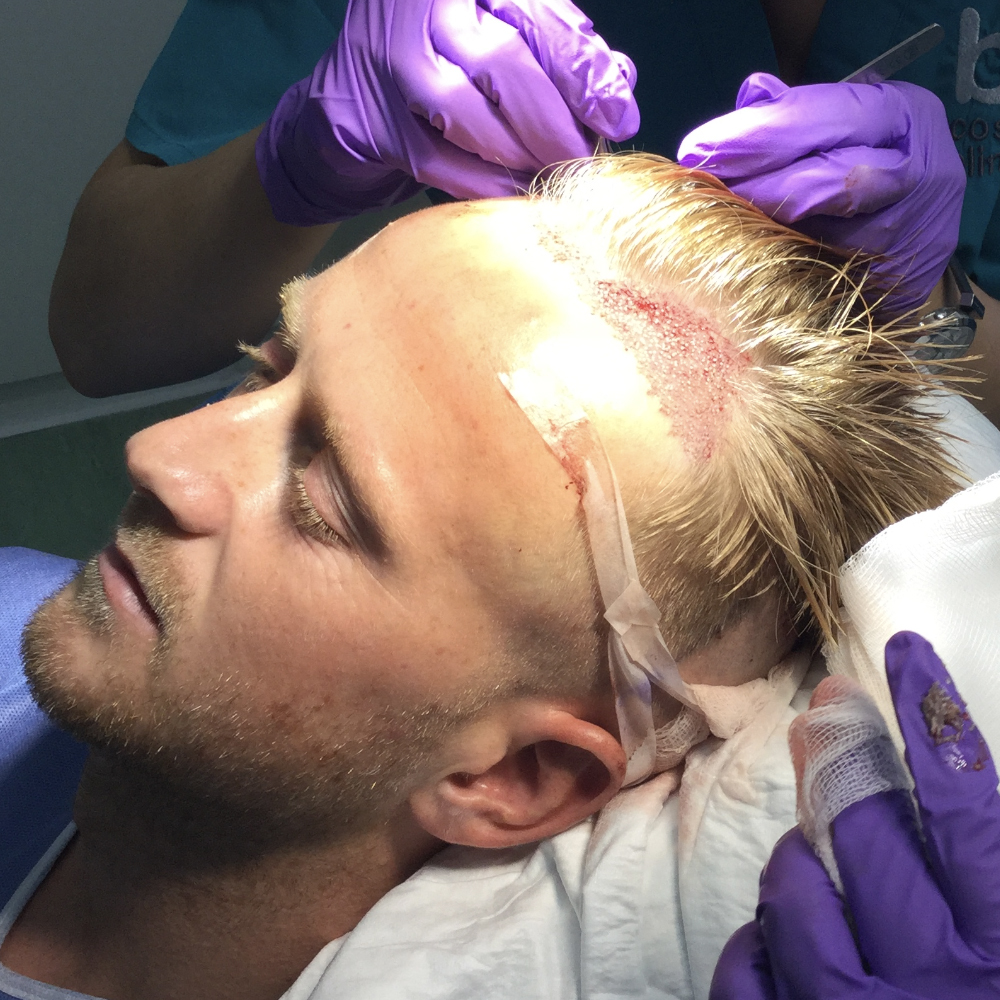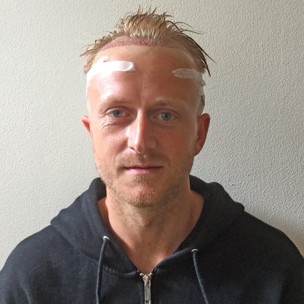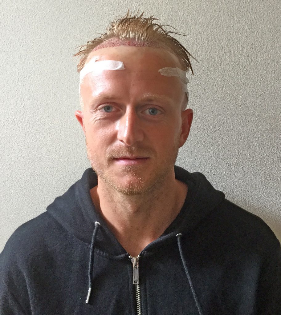 Ben had approximately 1800 grafts (3600 hairs) transplanted using the FUE method (this is a minimally-invasive hair transplant method where individual hair follicles are transplanted under local anaesthetic and with virtually no pain). The entire procedure took around six hours, with a break for lunch. After a couple of weeks the hairs fell out leaving healthy bulbs under the scalp.