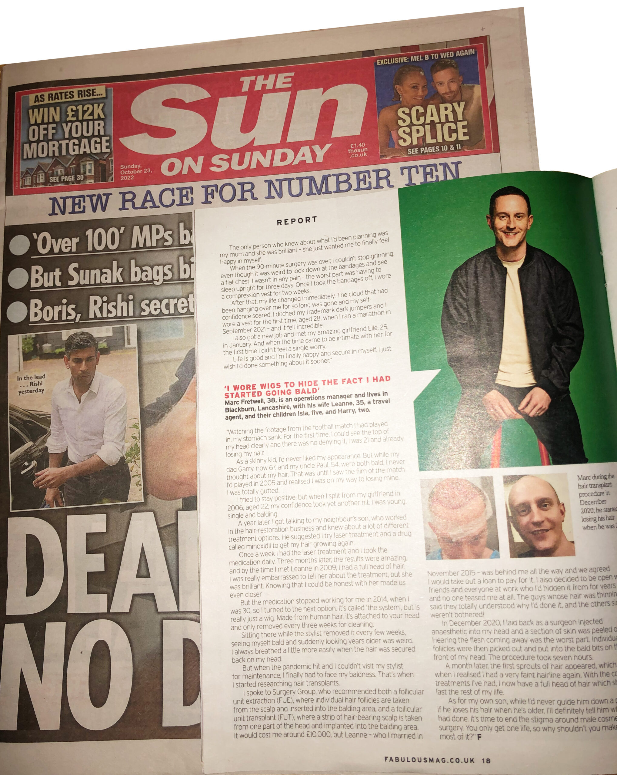 Marc was featured in an article about male plastic surgery in The Sun. He talked about treatments he had tried for his thinning hair and his experience with Surgery Group.